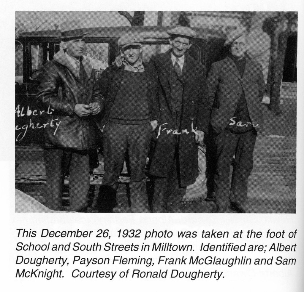 Sam McKnight, far right, was a true Milltowner. Born in 1872 he lived in Milltown nearly his entire life, a long life of 97 years during which he and his wife Mary had several children and at his death 13 grandchildren and 30 great grandchildren. Like many in Milltown he loved the outdoors and spent much of his leisure time fishing at his cottage on Big Lake.