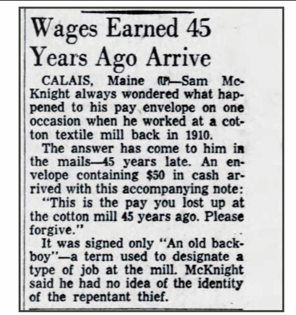 Of course, Sam was the luckier of the two. He had soon recovered from the loss of the week’s pay, but the thief’s conscience had, it seems, bothered him for 45 years. It was a terrible price to pay for the few dollars in Sam’s pay envelope. To his credit $50 was nearly 5 times what Sam would have earned that week in 1910. Wages for cotton mill workers in 1910 were about 20 cents an hour.