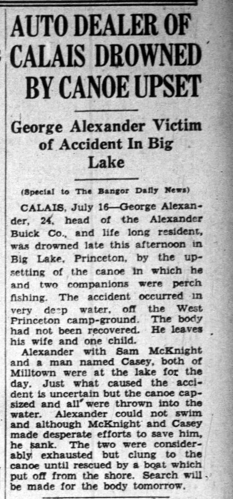 Sam was active in local politics and one of the leading citizens of Milltown, but he was not the sort of fellow to make the news. I find only one story in the newspapers which mentions Sam and that involved a tragic accident in 1934 when a fishing companion drowned.