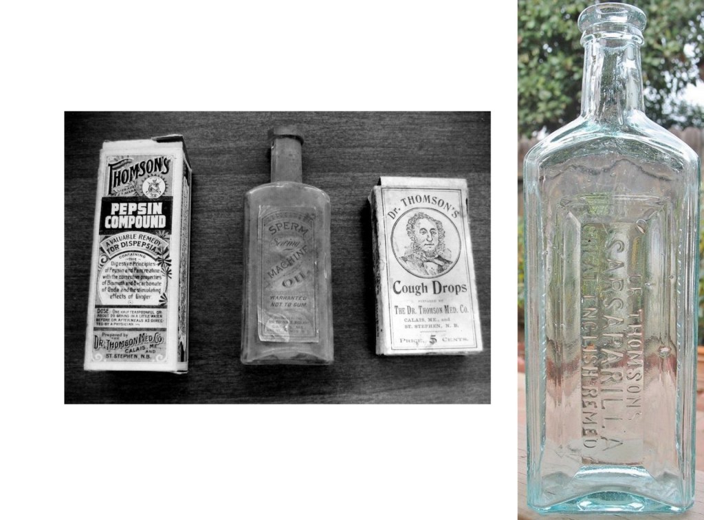 There is no question Thomson Sarsaparilla was initially a national success. The formula for this amazing remedy is not known but it is very likely it contained alcohol and perhaps opium which were the active ingredients in many patent medicines. Before the 1906 federal law restricted such drugs in patent medicine the McAllister’s and Lord’s drug stores on Main Street Calais sold cocaine toothache drops.