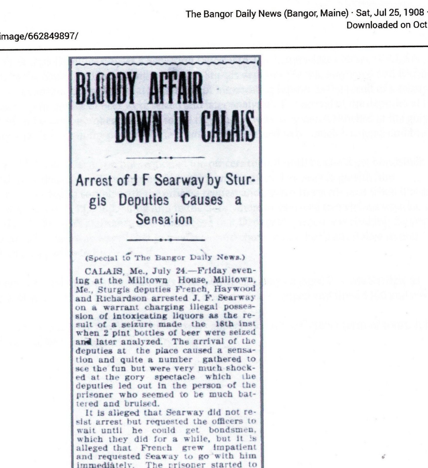 Arrest of J. F. Searway by Sturgis Deputies Causes a Sensation (Special to The Bangor Daily News.) CALAIS, Me., July 24. Friday evening at the Milltown House, Milltown, Me.,