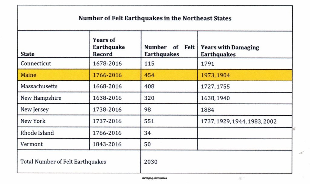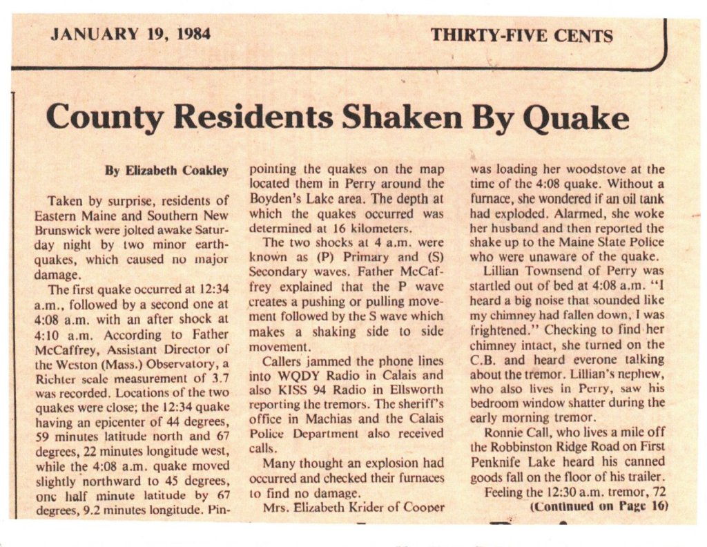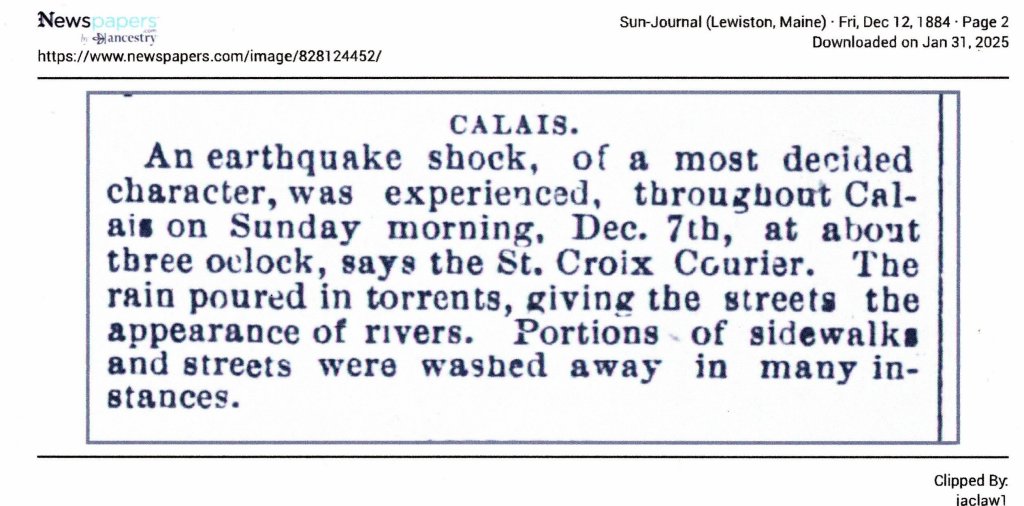 [Written February 8, 2025] The news broadcasts last week were all aflutter about the earthquake which shook New England. The epicenter was York Maine. “Earthquake rocks Boston Area”, “Maine Earthquake felt in Western Massachusetts” were typical of the hyperbolic rhetoric which introduced the reporting of the rather bland details of the actual quake which at 3.8 on the Richter Scale is classified as “light-often felt but only causes minor damage.” There are half a million such quakes worldwide every year. I thought it might be interesting to research whether Downeast ever experienced a quake in the “moderate” to “great” categories of the Richter scale.