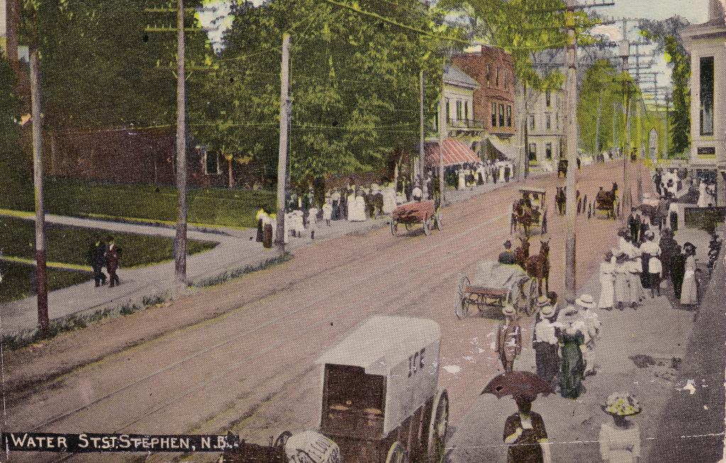 The above postcard can be dated to about 1900, the streetcar tracks visible in the photo were laid in 1895 and there are no autos which would have been present after 1905. In those days law and order in St. Stephen was maintained by the Town Marshall, Joseph McClure who housed any miscreants in the town lockup until they could be brought before the Police Magistrate, Daniel Crilley. Crilley was the judge and jury in St. Stephen for several decades and he gained some fame throughout not only Canada but also the United States. Visitors to Calais would, it appears, often visit Crilley’s court as it offered more entertainment than any other show in town. Locals also found court sessions more than a little entertaining. A typical day in court was described in newspapers throughout the United States in 1886.