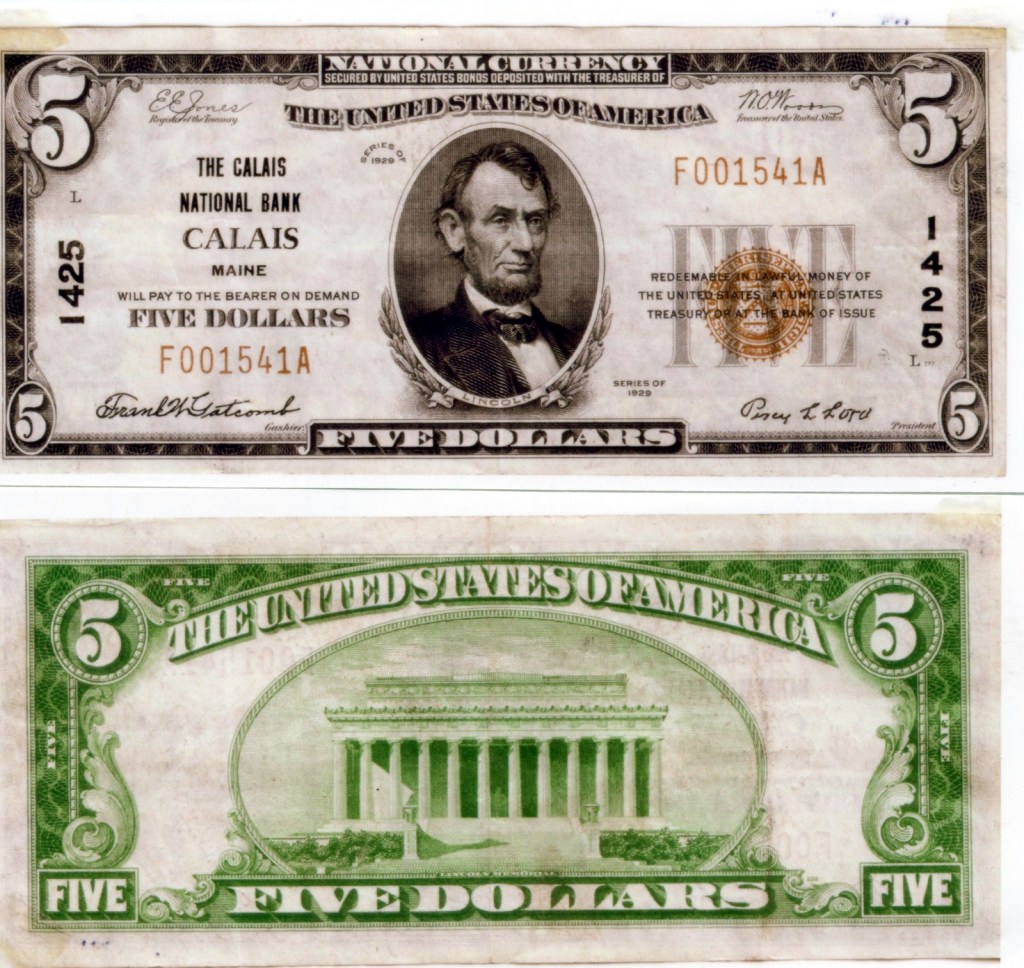 The signatures under Abe’s picture were those of Percy Lord and Frank Gatcomb Calais businessmen who also happened to be officers of the Calais National Bank. Percy Lord owned the drug store just up the street from the bank and was for many years its treasurer. In the photo his drug store is to the right of Beckett and Company. Frank Gatcomb was the chief cashier of the bank. Like most banks in the country during the Depression years the Calais National Bank was on the ropes and did not have the funds to pay depositors because there was a great shortage of money, in this case paper money, as the federal government wasn’t printing any. In desperation, the feds gave local banks the right to issue currency in order to increase the money supply and hopefully grease the wheels of the economy. Theoretically the local “money” was backed by assets deposited with the Treasury of the United States—says so just above Abe’s head on the bill—although few in the early 30’s would have taken that to the bank and if they had would almost certainly have left empty handed. And there was this- how much confidence can you have in a five-dollar bill issued under the authority of a friend or acquaintance who maybe can’t beat you at bowling or cribbage? Would businesses in Machias or Bangor accept the bill? It seems unlikely.