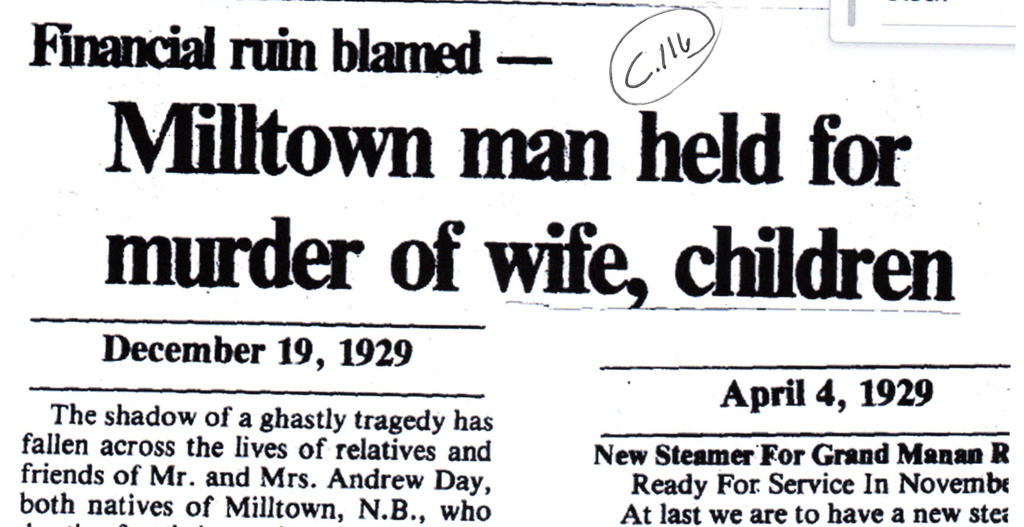 There was one Depression story involving local residents which is so disturbing I am including only the headline. Andrew Day murdered his wife and seven children in December 1929. Both were from prominent Milltown N.B. families and were then living in Three Rivers, Que. He had lost everything in the stock market crash a month earlier. Those wanting more information about the murders can easily find them on Wikipedia although I warn you will find the details very disturbing. It is fair to say that of all the suicides, murders and crimes that can be traced directly to the Crash of 1929, none is more shocking.