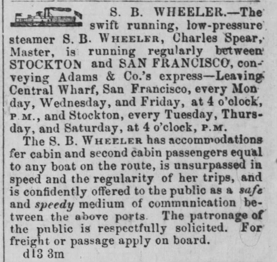 The Fanny, with the S.B. Wheeler in her hold, sailed from on December 24th, 1850, for San Francisco under the command of Captain Foster, an American and with several passengers from St. Stephen. She spent Christmas in Eastport. After a journey of 133 days, she reached San Francisco where the Fanny was again sunk and the Steamship S.B. Wheeler reemerged from the hold, ready for service in the Gold Rush.