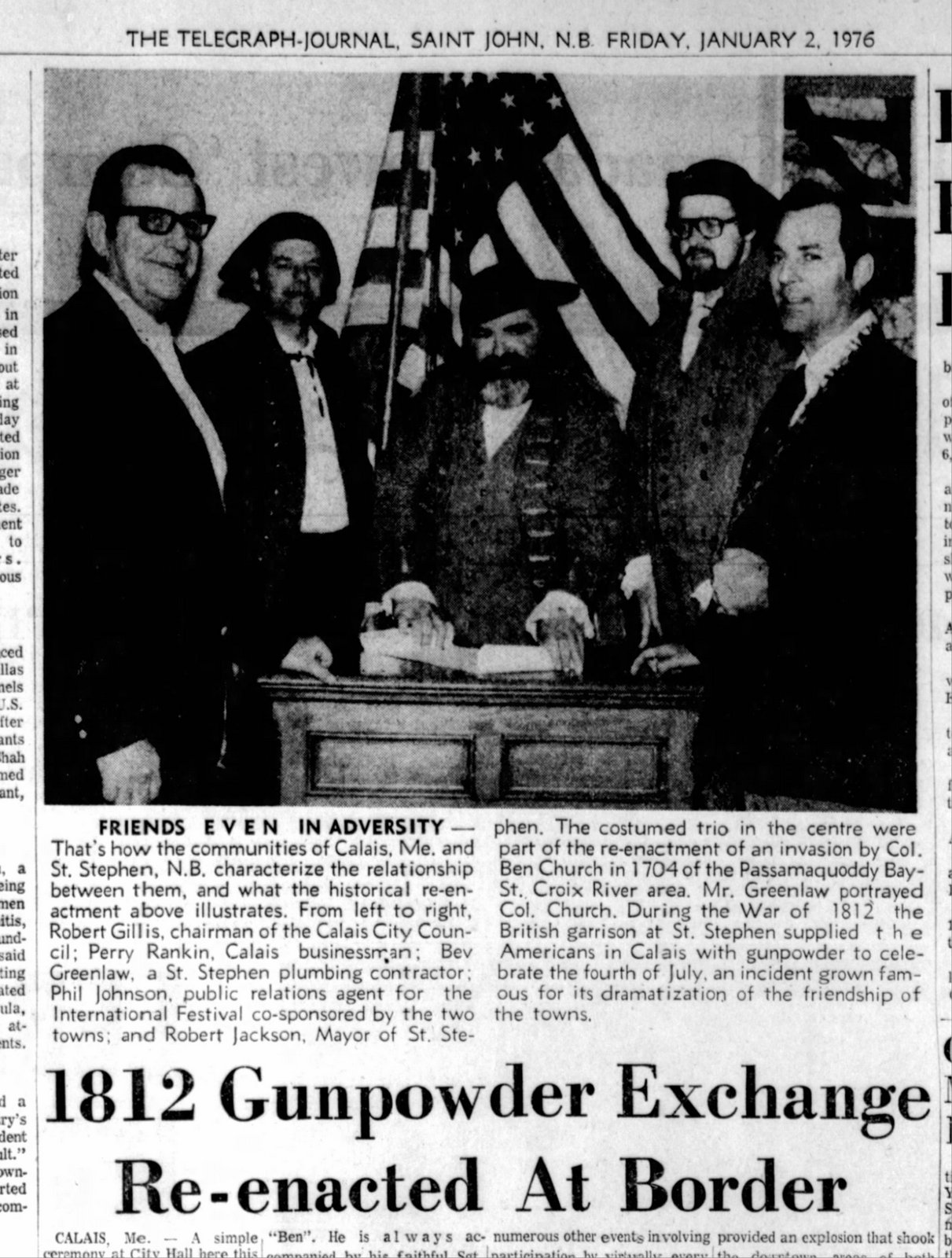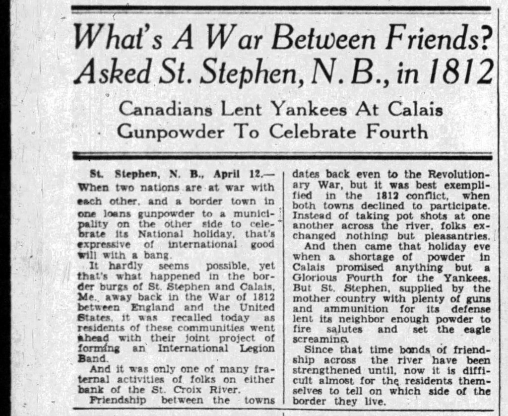 Over and over the story has been told of the time when gunpowder was stored here in the early days and that when the military authorities instituted a checkup of supplies, St. Stephen had to confess that they had to give it to Calais so they could have a darn good rumpus on the 4th of July but St. Stephen never had any more gunpowder entrusted to it by the military New Brunswick. At least not then.